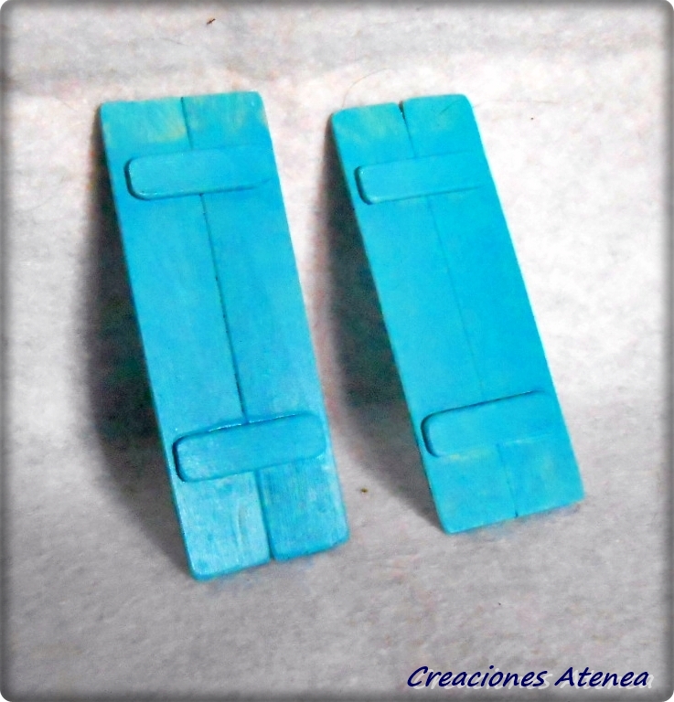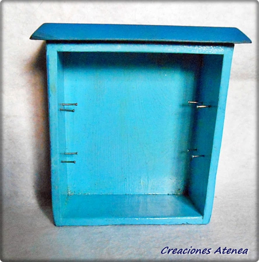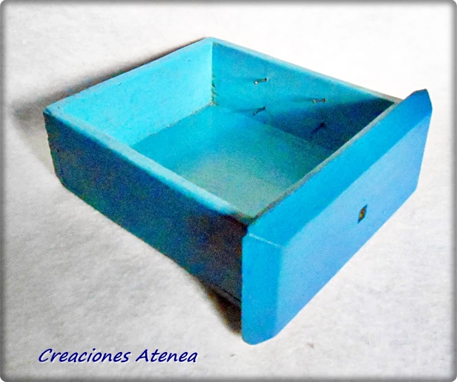 Después de lijar el cajoncito y limpiar el polvo, lo pinté de azul marino por fuera y de azul claro o turquesa por dentro. No estoy segura porque yo hice las mezclas con pinturas acrílicas hasta que salió el color que deseaba.