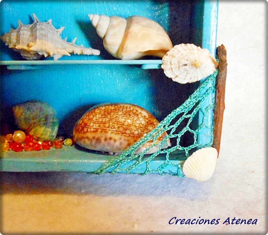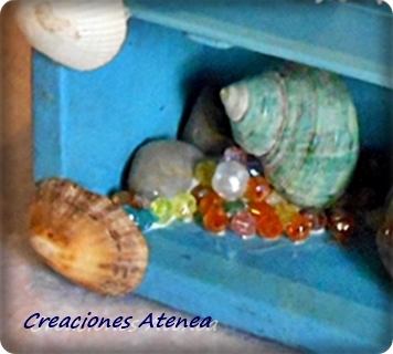 Aquí ya he añadido algunas conchas y una red de ganchillo, y unas piedritas; y unas rocallas (creo que se llaman así) transparentes de diferentes colores, como si fuera arena multicolor.