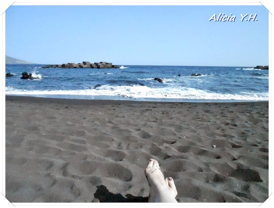 En una playa de arena negra llena de rocas. Apenas pude bañarme, pero disfruté del sol, unos 25º en pleno diciembre, y me remojé los pies (y algo más) con el oleaje, que daba un poco de miedo... A La Palma la llaman "la isla bonita", y no me extraña. Dejo para otra entrada de otro de mis blogs las fotos de los bosques y de las casas con fachadas de colores...