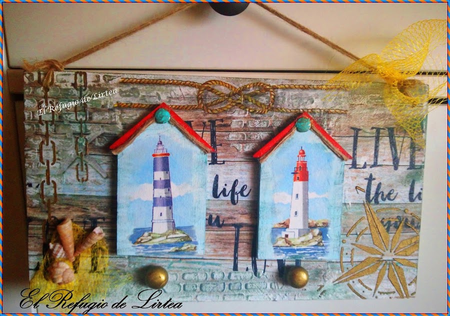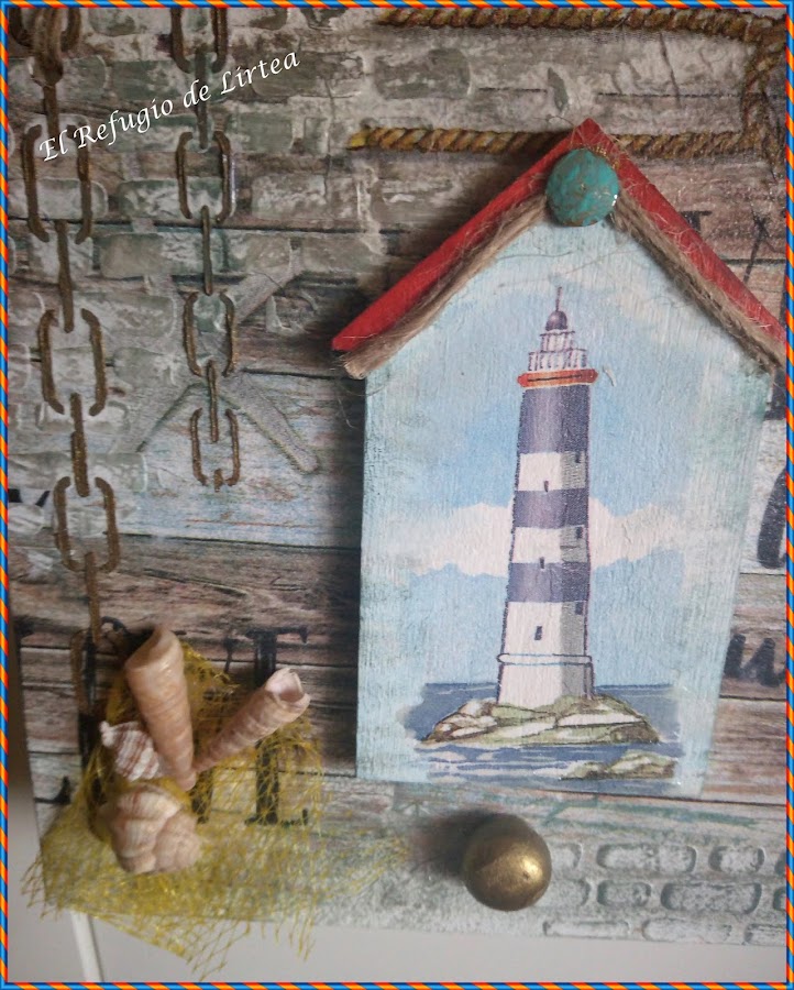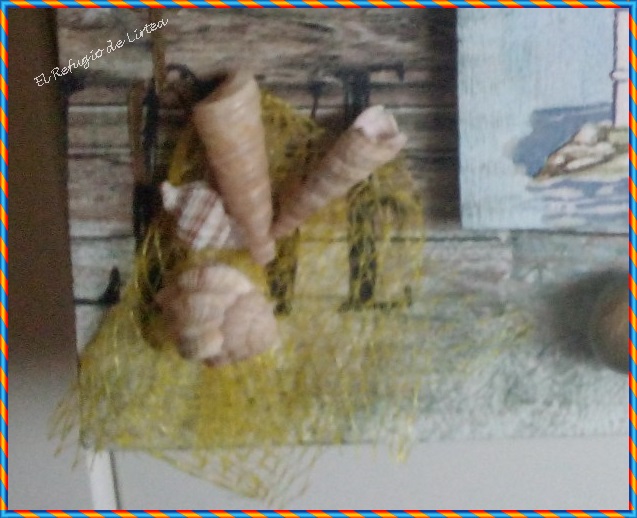 Para darle un aspecto mas "marinero" he pegado unos trocitos de maya amarilla ( la maya donde vienen los limones que compramos en el super) y encima he pegado unas conchas.