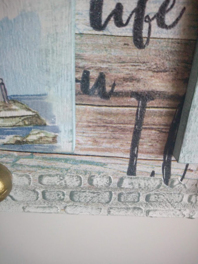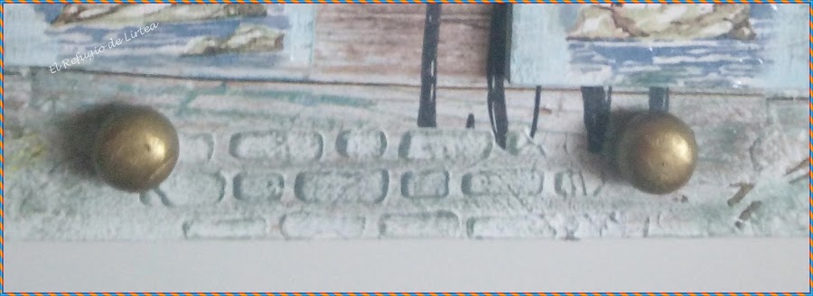 Hicimos el decoupage en la base con dos servilletas muy marineras, como podéis observar y una vez realizado el decoupage hicimos stencil en relieve con la pasta ferro.