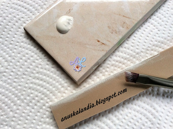 3.- Pasamos a difuminar los bordes de todas las piezas, salvo la luna. Colocaremos un par de gotas de pintura blanca en una superficie lisa, en mi caso, ya conocéis a mi inseparable rodapiés. Este color de pintura es para todas las nubes rosas. Para difuminar, cogemos una pizca con la parte más larga del pincel y comenzamos a hacer un movimiento de barrido de izquierda a derecha varias veces. Repetimos este movimiento hasta tener pintado todo el borde de cada nube. Hacemos lo mismo con las piezas de las que se componen ambos osos, en este caso de color marrón claro.
