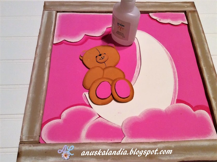 9.- Pegamos el oso, primero la cabeza, el cuerpo apoyando un pelín en la barbilla, el brazo por encima del cuerpo y cara, las patas por encima del brazo y cuerpo. Todo pegado con pegamento instantáneo, si lo prefieres y trabajas mejor, puedes pegarlo con silicona caliente.