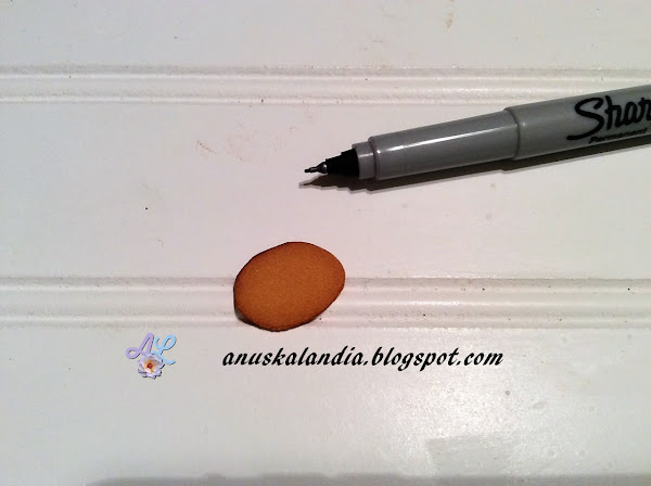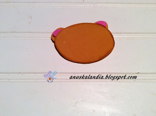 8.- Pintamos el hocico de ambos osos con un rotulador negro permanente. Pegamos la parte rosa de las orejas a la parte marrón y también el hocico en la cara. Lo haremos en ambos osos.