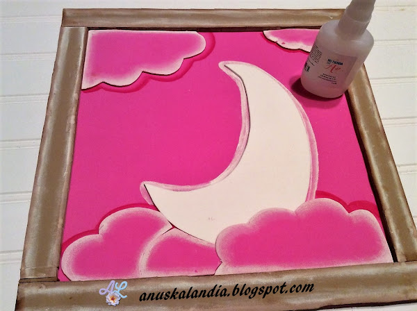 11.- Para finalizar con un pinta puntos o la parte posterior del palito de brocheta, haremos puntos en las nubes y en el fondo rosa. Si como en mi caso, hay un pequeño fallo, siempre se puede tapar, pegando algo encima. Antes que plantearse tirarlo o rehacerlo. Yo he puesto unos mini corazones pegados.