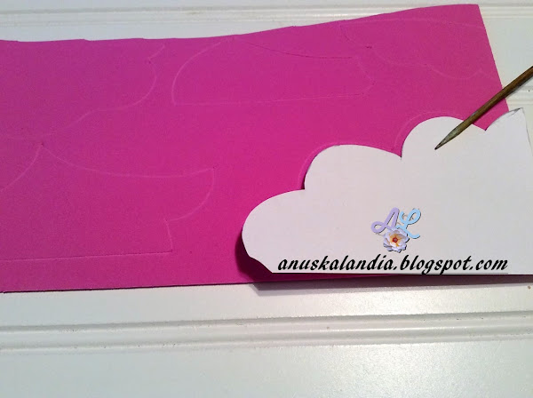 7.- Vamos a la fase de montaje. Pegamos las nubes como se observa en la foto. Anteriormente, habremos hecho una marca con lápiz suavemente, un poco por delante de cada nube y pasamos difuminando en rosa donde van las nubes y en blanco donde va la luna.