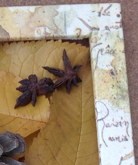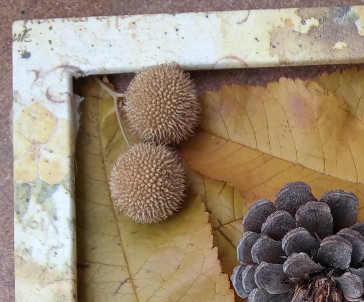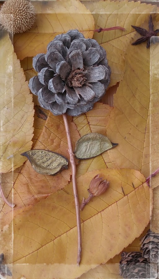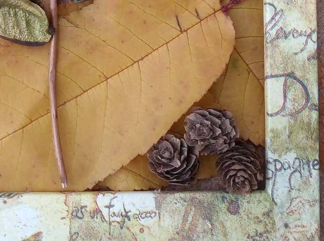 Aproveché el fin de semana que estuve fuera de Madrid y recogí hojas caídas de mi cerezo, algunas pequeñas piñas del campo y frutos secos del árbol del platanero, alguna rama de la poda de mi rosales y con todo hice este cuadro.