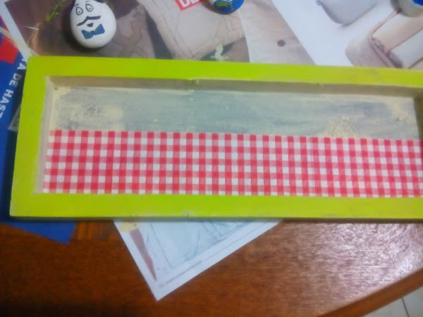 En donde colocaré las piedras pegué un pedazo de servilleta decorativa con cuadros rojos y blancos, ideal para cocina, a mi particularmente me encantan las cocinas con colores rojos, verdes, amarillos en fin bien coloridas :D