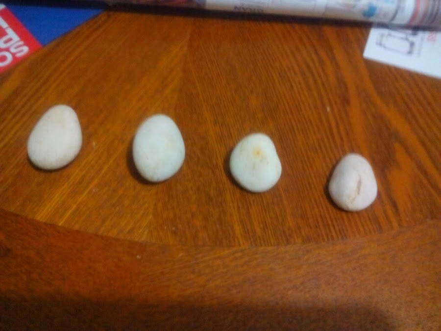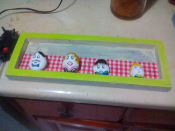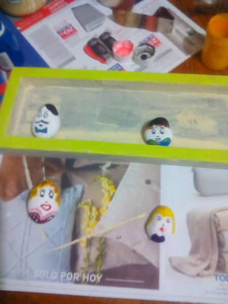 Ya preparada la base del cuadro, voy con mis piedras, y les confieso ahora que cuando mi madre vio las piedras colocadas en línea me ha preguntado, que vas a hacer con esos huevos ahora? y ahí me cayó del veinte de la idea del cuadro para cocina jeje con una familia de huevos-piedra.