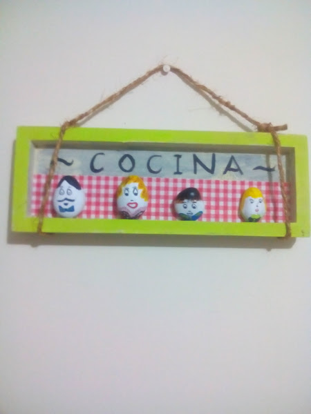 Con el mismo pincel dibujé el letrero cocina le amarre una cuerda y colgué en mi cocina.