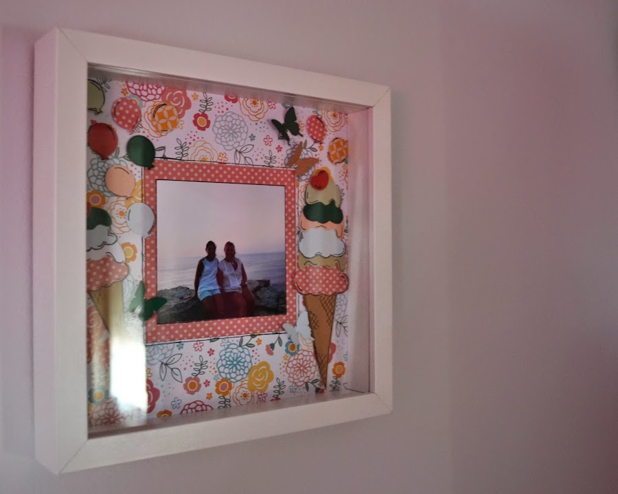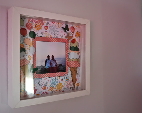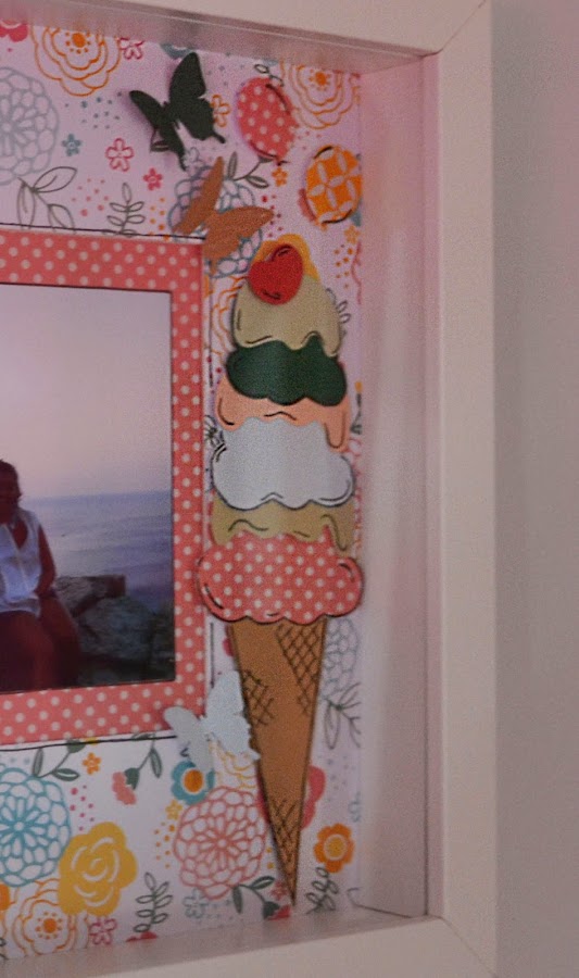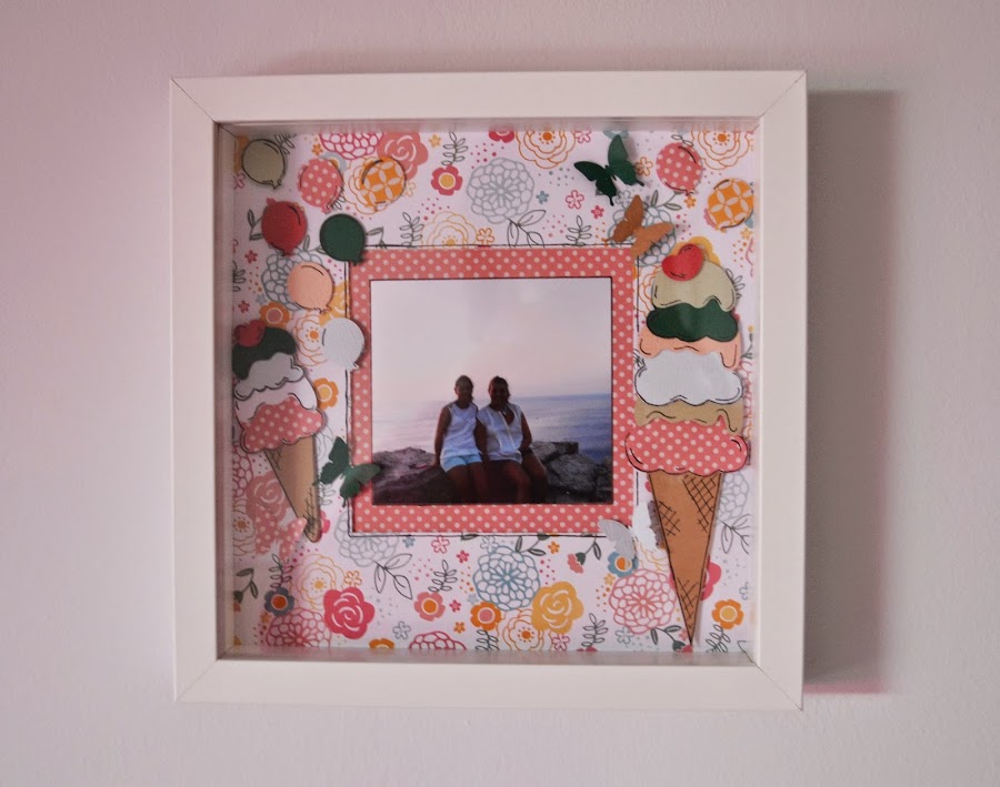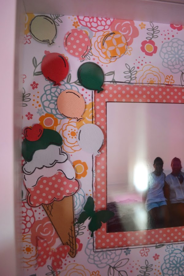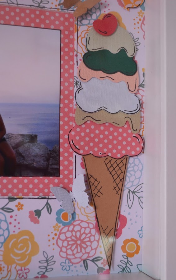 Para el fondo he utilizado dos bonitos papeles estampados: uno de flores y otro de pequeños lunares., y para la decoración, he colocado unos bonitos y gigantes helados en los laterales hechos con diferentes papeles, unos globos y unas mariposas de colorines.