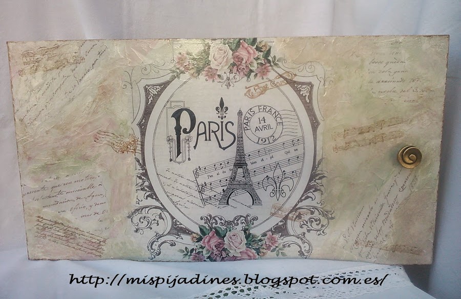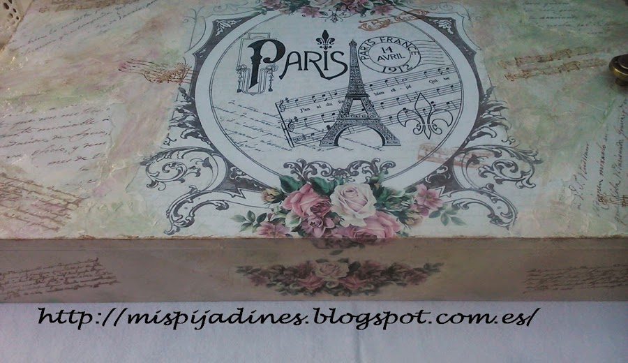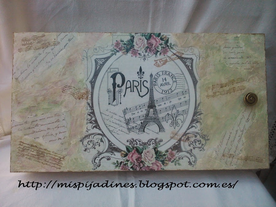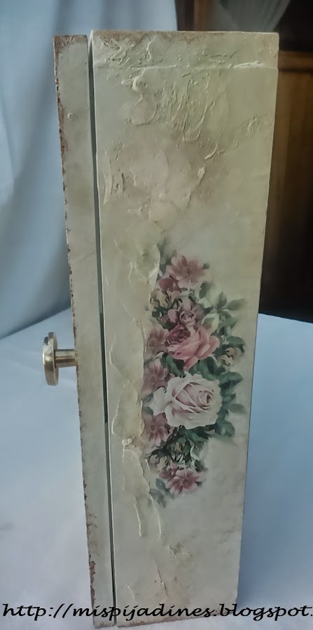 Proceso: Despues de dar imprimacion todo terreno a todo el cajon, le di una mano de pintura en color tapioca, a continuación hice el decoupage, para seguir con el estucado en todo el frontal, una vez seco y lijado, fui dando aguadas con verde manzana, beige , ópalo y tapioca, nuevamente vuelta a lijar..y una mano de barniz