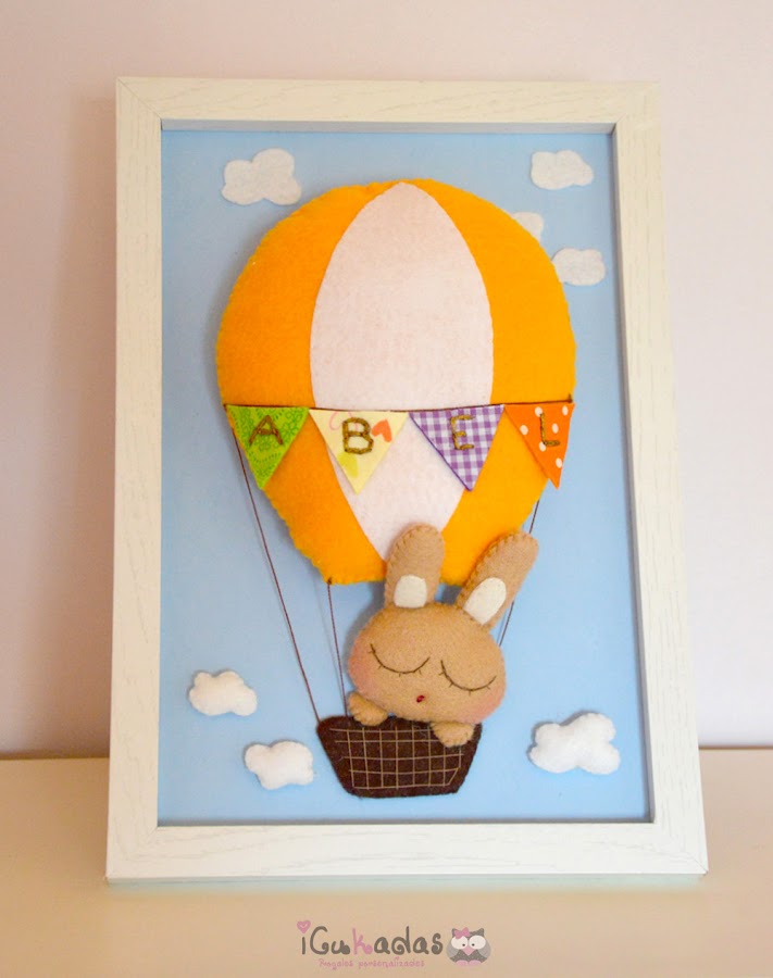 En principio hemos hecho este modelo nuevo, del conejito volando en el globo, en tonos naranjas, con algo en verde y en morado que es como está decorada la habitación donde va a estar, pero se puede hacer para niñas, con una conejita con lazo, en tonos rosas o lavandas..... hay mil opciones, que para eso son personalizados.