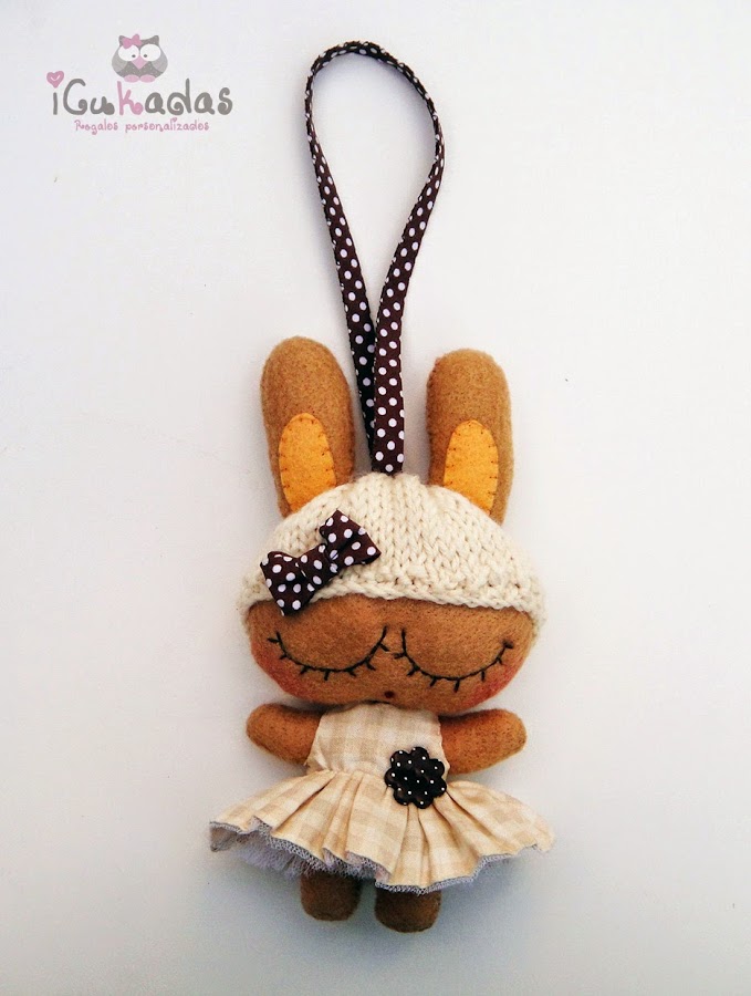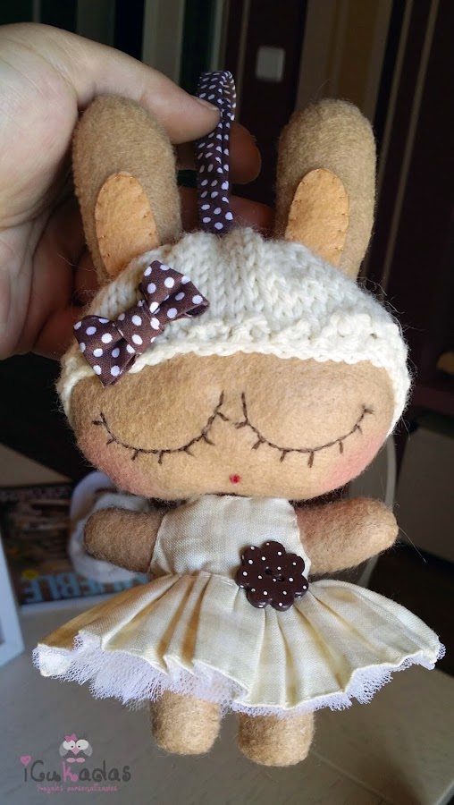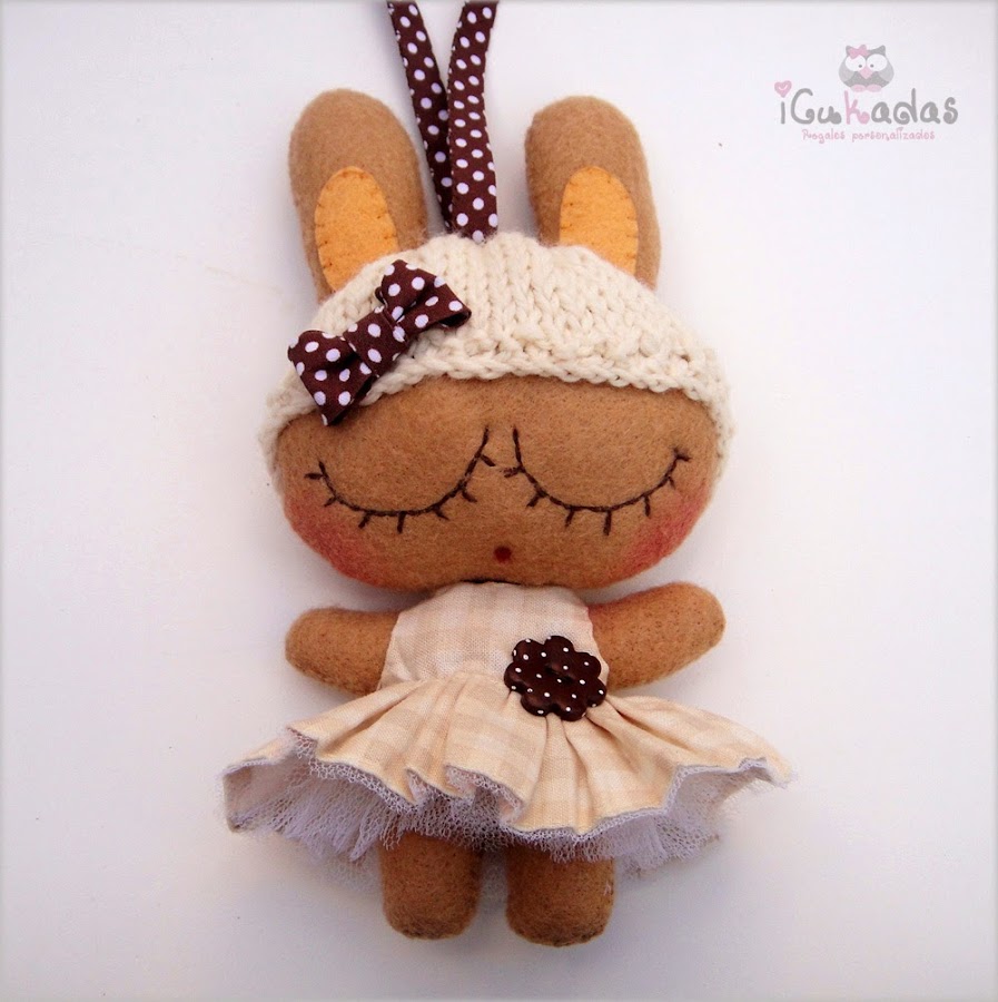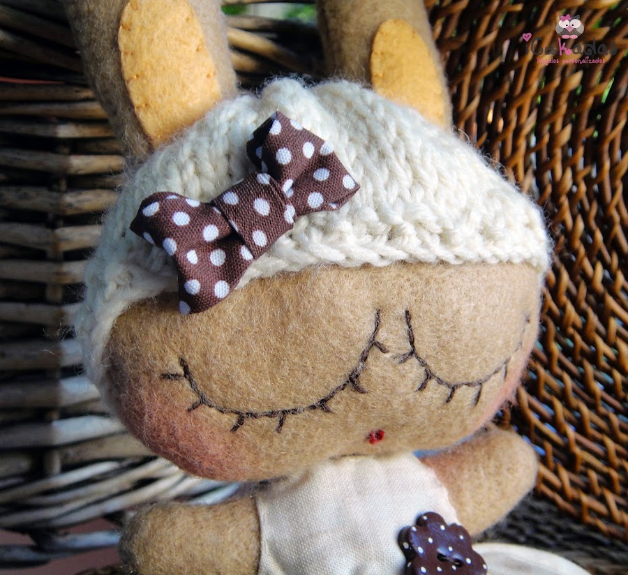 Y lo más trabajoso, la conejita de fieltro, con gorro de lana, vestido de tela y apliques de fimo, una pepona como su destinataria!!