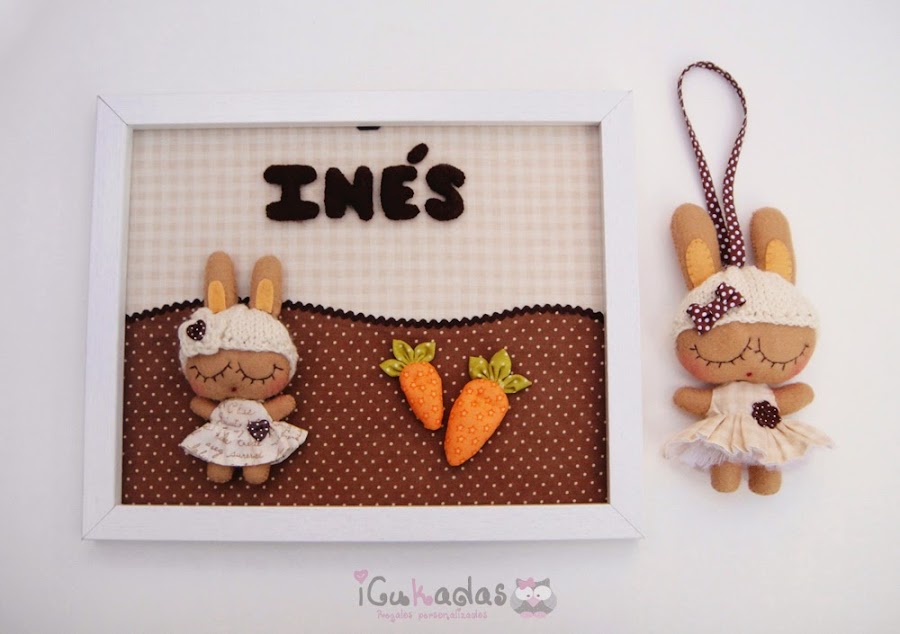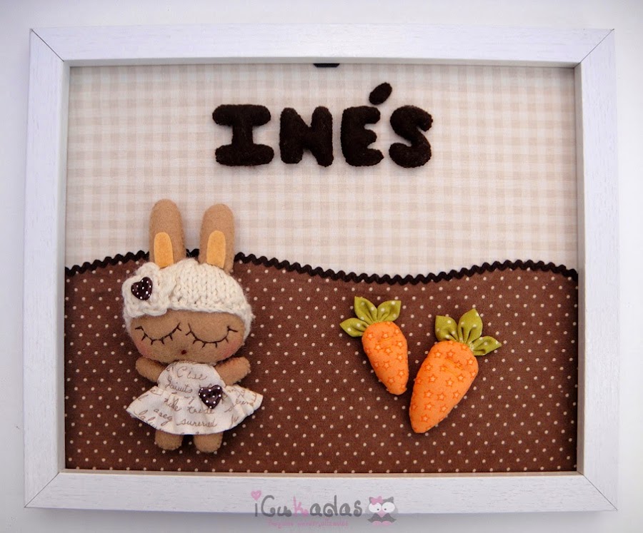 Las zanahorias son de tela, hechas en relieve, bien gorditas, y el nombre igual, pero en fieltro.