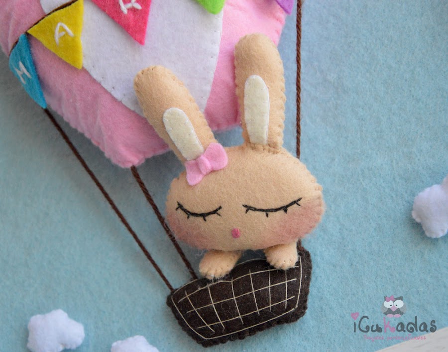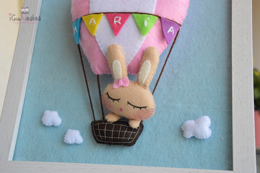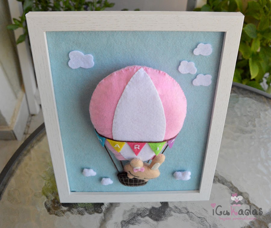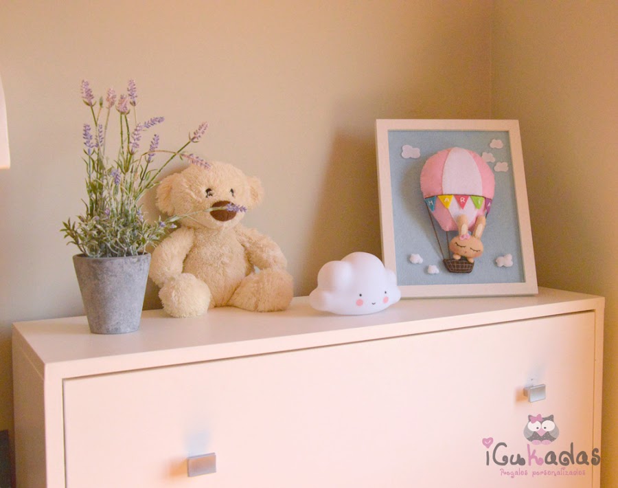 Y aunque las que seguís las Redes Sociales, ya lo habréis visto, os lo quería enseñar con detalle. Un cuadro personalizado para bebé, esta vez una conejita montada en un globo, con un cielo celeste de fondo.