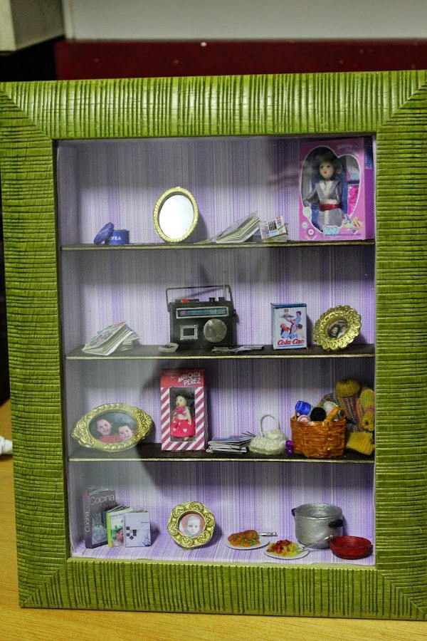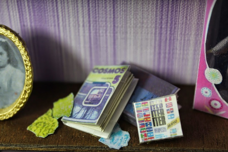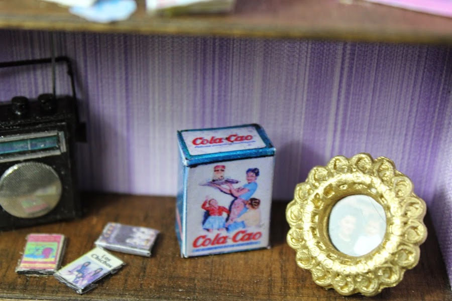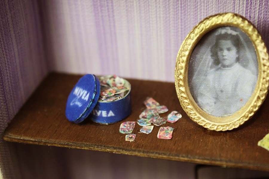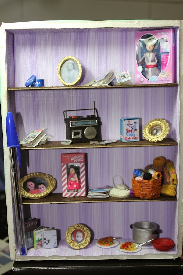 Estas fotos corresponden a su infancia, así que hice una lata de nívea de esas que teníamos todas llena de cromos. puse una foto de su comunión y al lado unos libros de nuestra época de egb. además de esas reglas del mapa de España que teníamos todos. y como no la nancy esa muñeca que todas teníamos.