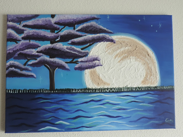 El cuadro está pintado en oleo, y la luna está hecha con una pasta que se llama Vandal, que sirve para dar relieve, además las estrellitas del fondo brillan en la oscuridad, ya que están pintadas con una pintura especial que brilla en la oscuridad.