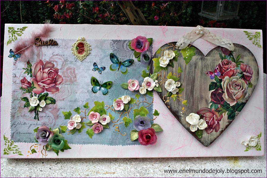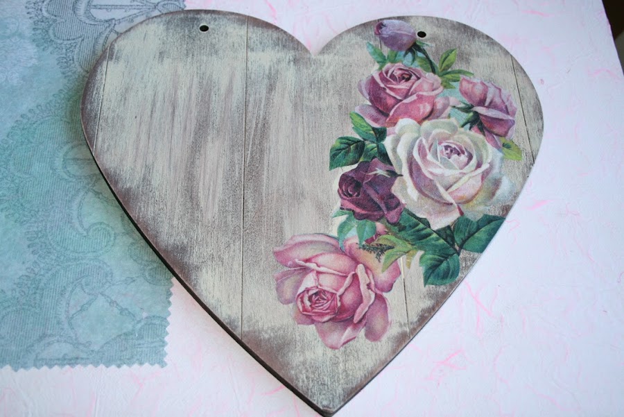 Pinte envejeciendo este corazón en madera y hice decoupage con las flores....el efecto me iba gustando, así que poco a poco.