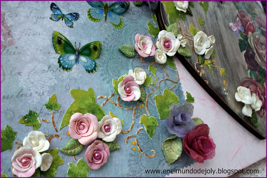 Teñia masa, hacía la flor y pegaba...así durante varios dias dando tiempo al secado de todo para poder montar. También puse esas mariposas que veis revoloteando por ahí, que le dan un toque super dulce verdad?