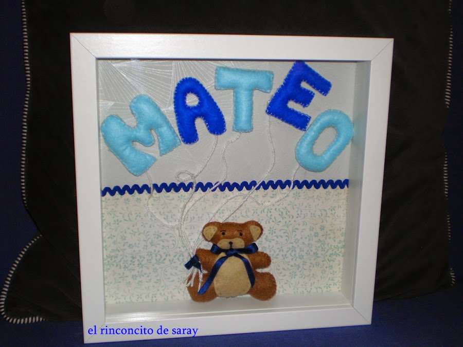 las letras y el osito están hechos de fieltro y rellenado para que tenga volumen y el fondo son dos papeles diferente separados por una cinta de onda .