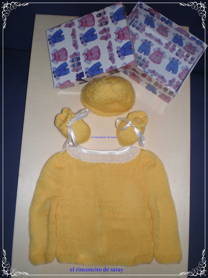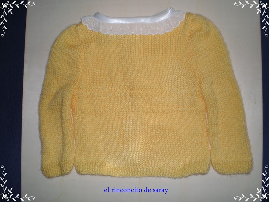 Empezamos con un conjunto hecho a punto con una lana finita . le puse en el cuello una puntilla con un bies para que sea mas agradable para el bebe y que da muy mono