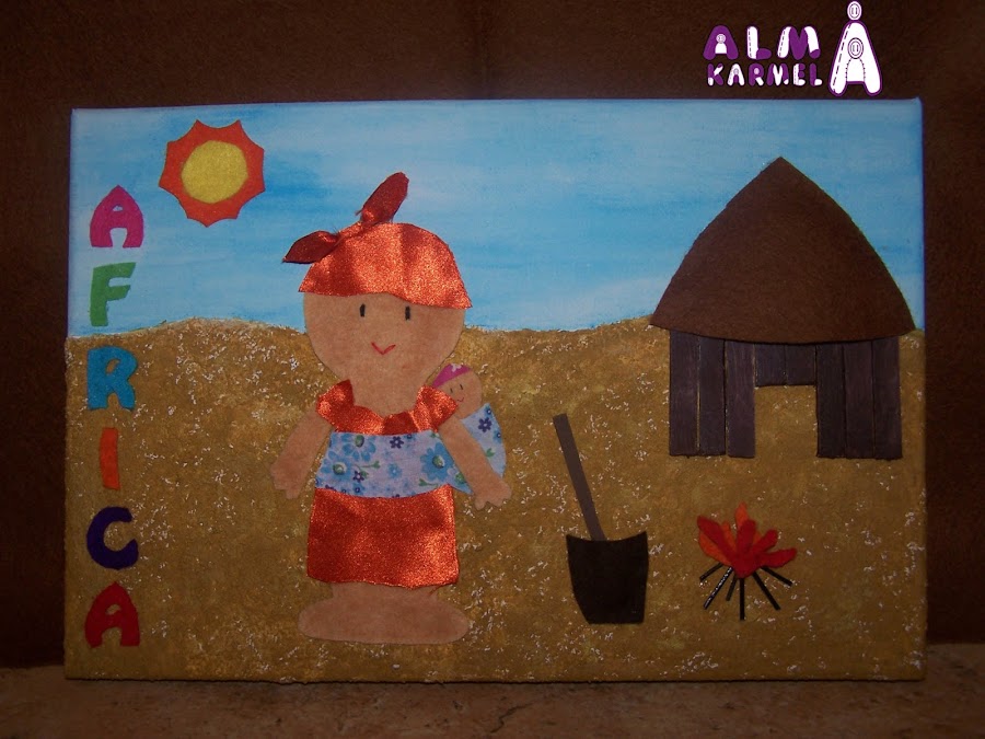 Y el cuadro para la pequeña África, una mamá porteando a su bebé mientras prepara la comida al fuego. No le falta detalle, su choza atrás, y su cuenco para la comida.