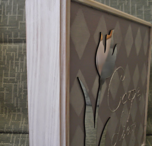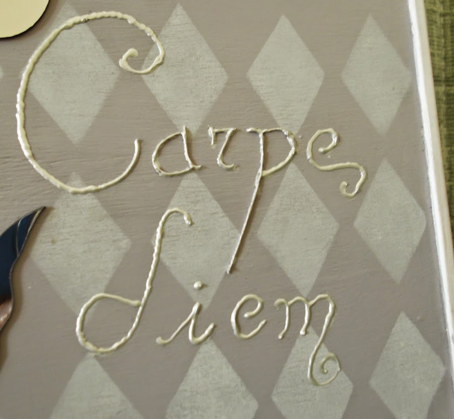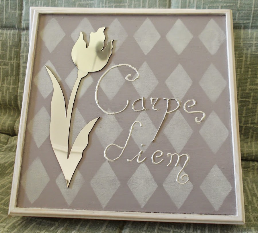Por último le pego un pequeño espejo con forma de flor y con pintura en relieve escribo la leyenda "Carpes diem" (Vive el momento)