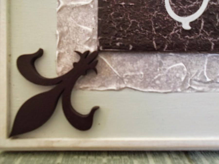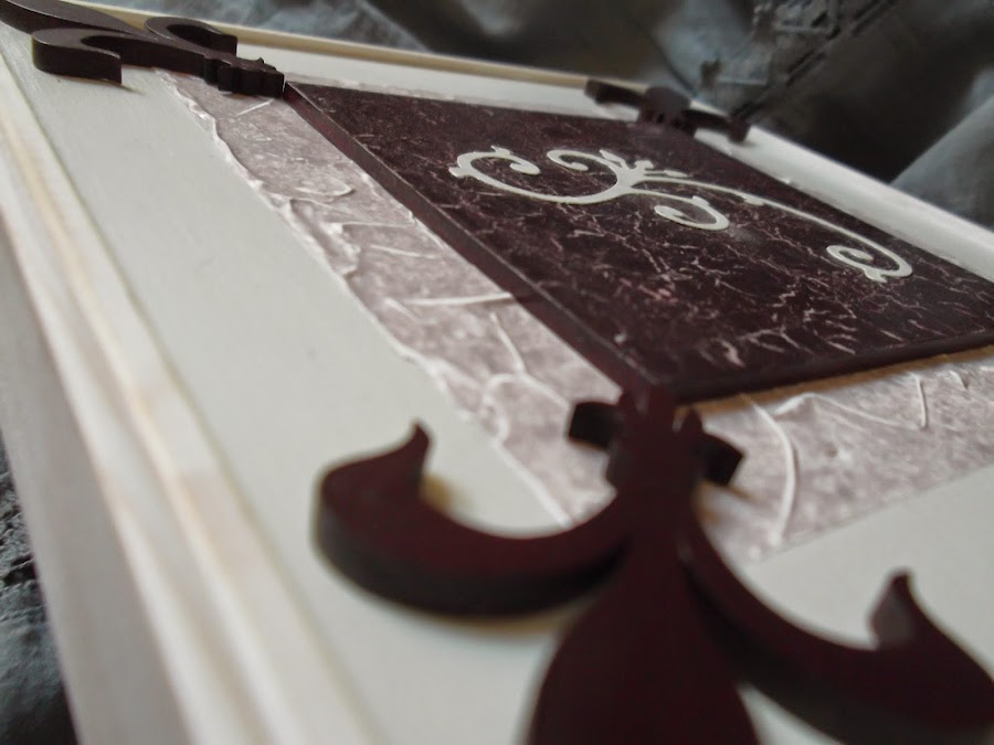 Pego la tabla y para terminar unos adornos, pintados en color ciruela con la forma de flor de lis.
