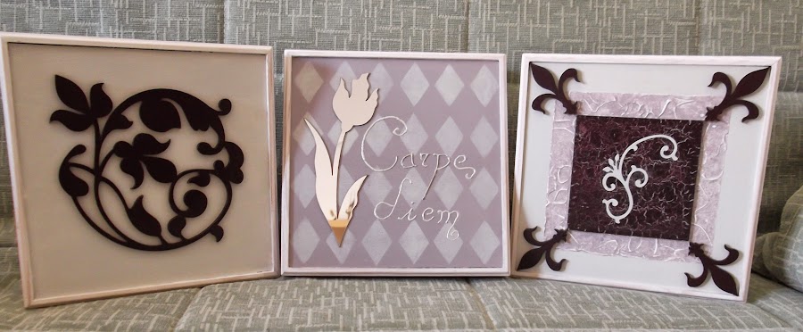 Estos son los tres nuevos que he realizado. En total serán 9 cuadros, todos del mismo tamaño, los marcos iguales, pero con distintos motivos y combinando distintas técnicas. Sólo empleo 4 colores para decorarlos, guardando así cierta armonía.