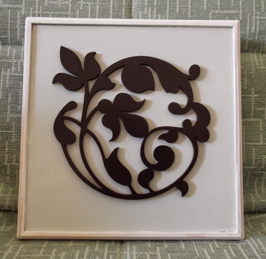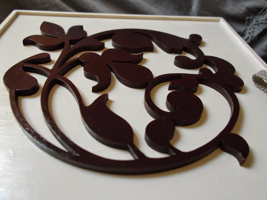 Compré el adorno de marquetería, lo pinte con dos manos de acrílica color ciruela. Barnizar y pegar.