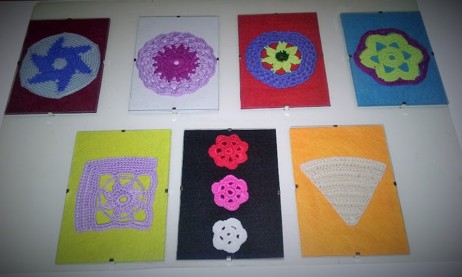 Hace unas semanas, quería hacer algo diferente con mandalas. Comiendo en el restaurante "el mussol", había unos cuadros de tapetes de antaño hecho a crochet. Me inspire y me dio la idea, de hacerlo a lo moderno. Tejer unos mandalas de colores, formas distintas y las enmarque. Aquí tenéis el resultado: