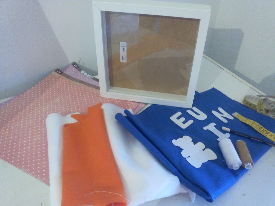 ya que tenemos el nombre y el muñeco cosido nos toca elegir el fondo del cuadro que puede ser de un solo color o utilizar dos papeles deferentes como si fuera un zócalo os pongo un ejm