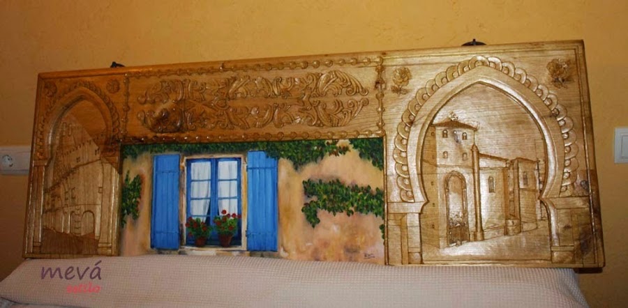 Y empezamos con el primero a cargo de Eva y Maite esta hermosa obra esta hecha sobre la madera de la antigua repisa de una chimenea y finalmente integrado a la cabecera de la cama, que les parece, brillante verdad, doble creatividad?