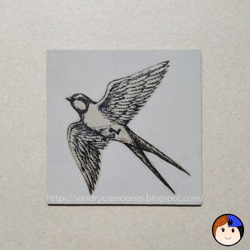 El objetivo de este cuadrito era trasferir en el cuadrito de madera pintado con pintura a la tiza "Gris London" una imagen de un pájaro. Para poneros en situación la técnica transfer consiste en pasar un motivo de un papel a otra superficie con la ayuda de un líquido transfer. Para poder utilizar esta técnica el motivo o la imagen debe estar impreso con impresora láser.