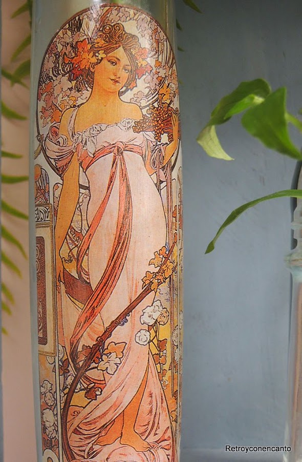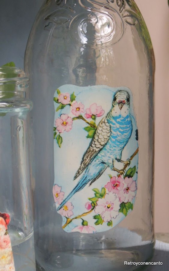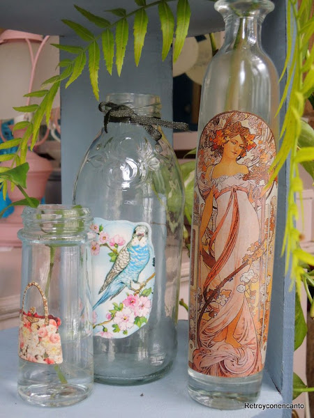 Hay una frase que usamos con relativa frecuencia: "no es mi momento", para hacer referencia a actividades, vivencias...que nos encantaría realizar, pero que puntualmente no son factibles, y dejamos en "asuntos pendientes". Viajes no realizados porque los niños eran pequeños, aficiones aun no cultivadas por falta de tiempo... Listas de cosas que algún día llevaremos a cabo, estamos seguras, cuando "sea el momento". Y un poco es lo que nos ha pasado con el vidrio y el decoupage... Vimos una imagen que nos enamoró, y que, por cierto, ni siquiera hemos guardado..., y nos entró inmediatamente la necesidad de probar esta técnica sobre ese material. Estaba claro que había llegado "el momento". Rebuscamos por el arsenal de papeles, láminas, sellos...