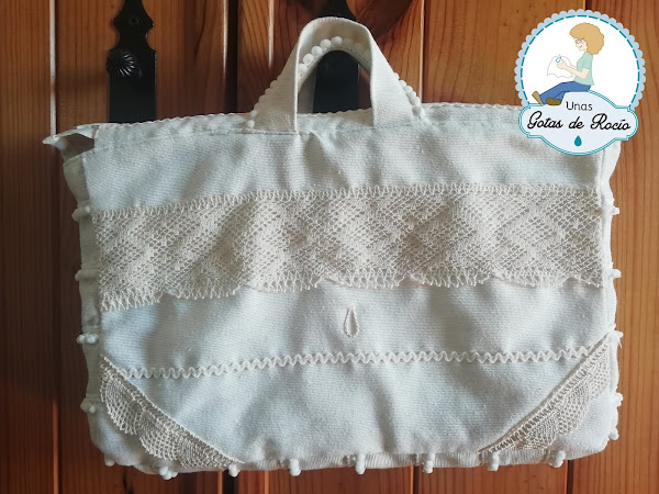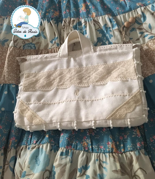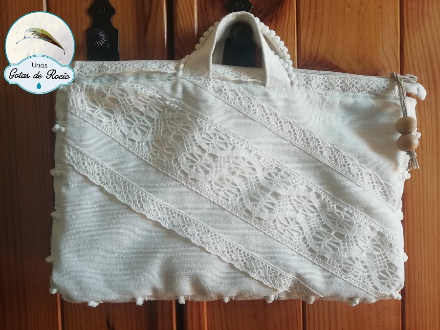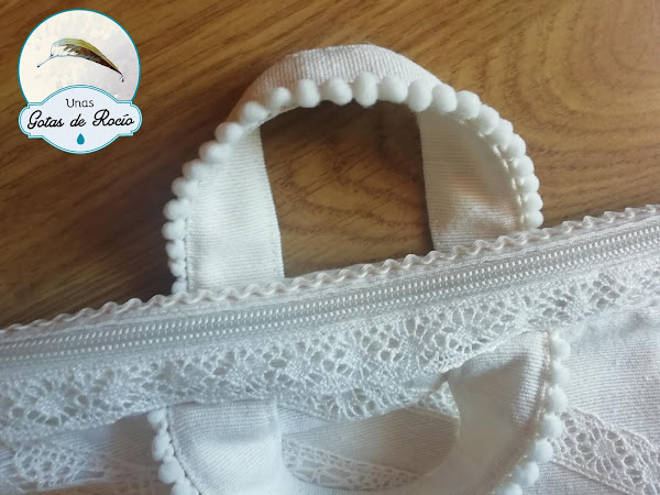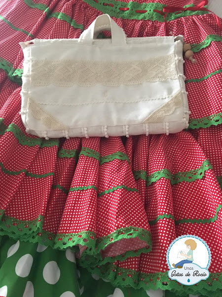 En color neutro, para que combine con todos sus trajes de gitana, con dos pequeñas asas para llevarlo de mano, con cierre cremallera para que no se vea qué hay dentro y adornado con puntillas, madroños y ondulinas, para que lo funcional no reste coquetería.