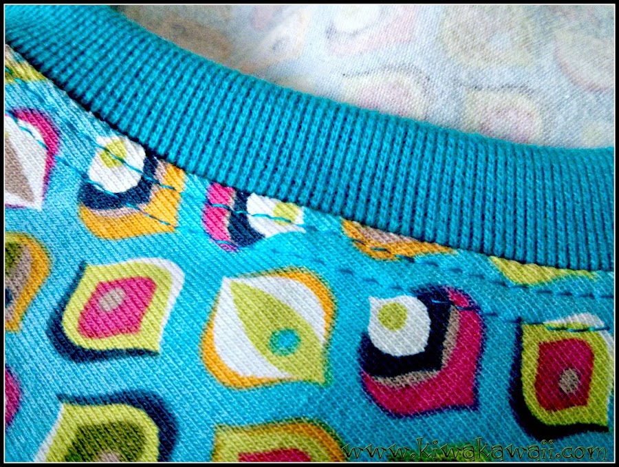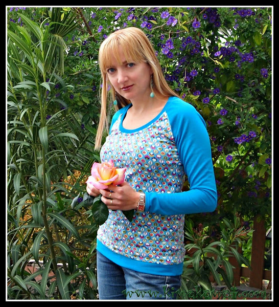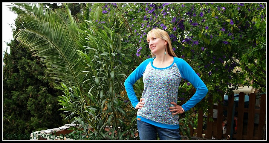 Pues es lo que me pasa con la camiseta raglan Naii! Ya lo cosí hace tiempo, en rayas marineras con un corazón rojo, en esta ocasión he elegido esta tela estampada que me chifla, combinada con azul liso y puño igual, todo de Cal Joan.