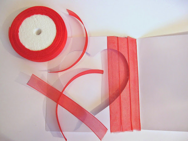 3.- Abrimos la tarjeta y por la parte interior vamos pegando nuestra cinta de gasa o tul roja que previamente habremos cortado en trozos de 14,5 cm de longitud.