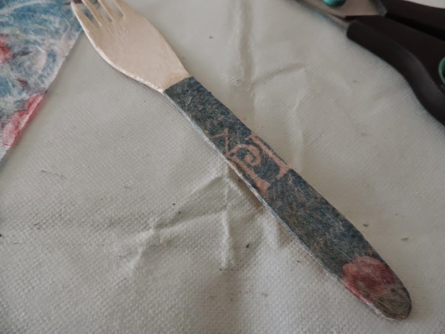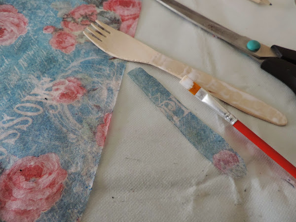 Lo primero preparar y tener todos los materiales a mano, dividimos el papel de decoupage ( en mi caso en 4 porque es de 50x50 ) y recortamos uno de ellos ( con un cuadrado hay suficiente para 10 tenedores y 10 cucharas) , disponemos un poco de cola en un tarrito y empezamos.