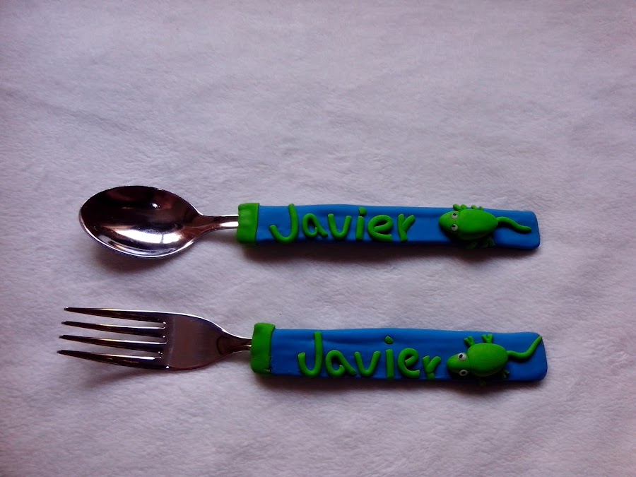 Unos cubiertos decorados con unas pequeñas lagartijas y personalizados con su nombre