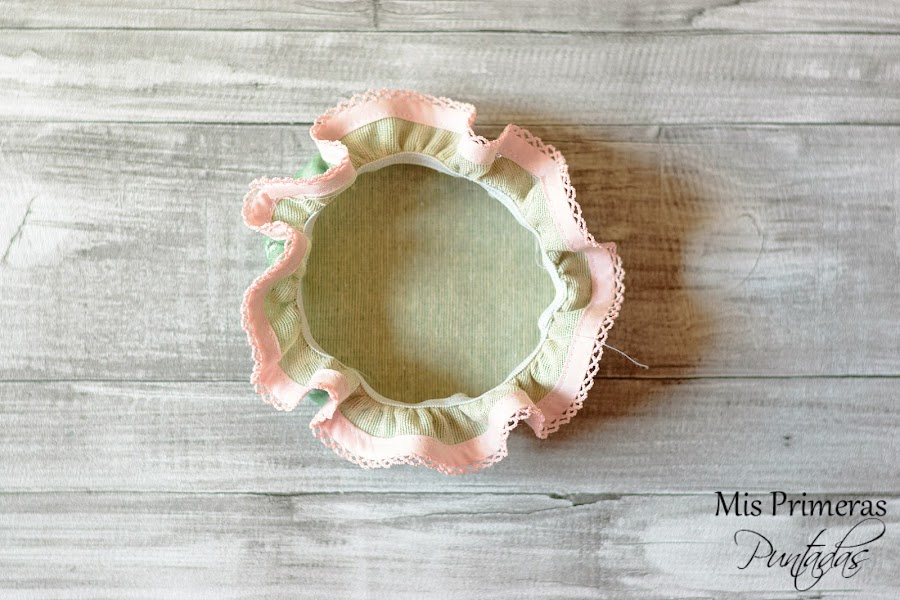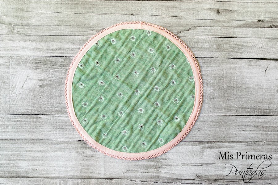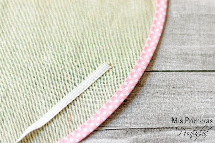 Cortaremos el patrón en tela y le coseremos un bies bonito alrededor, los que yo he usado son de Lola Botona Granollers.
