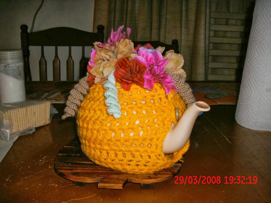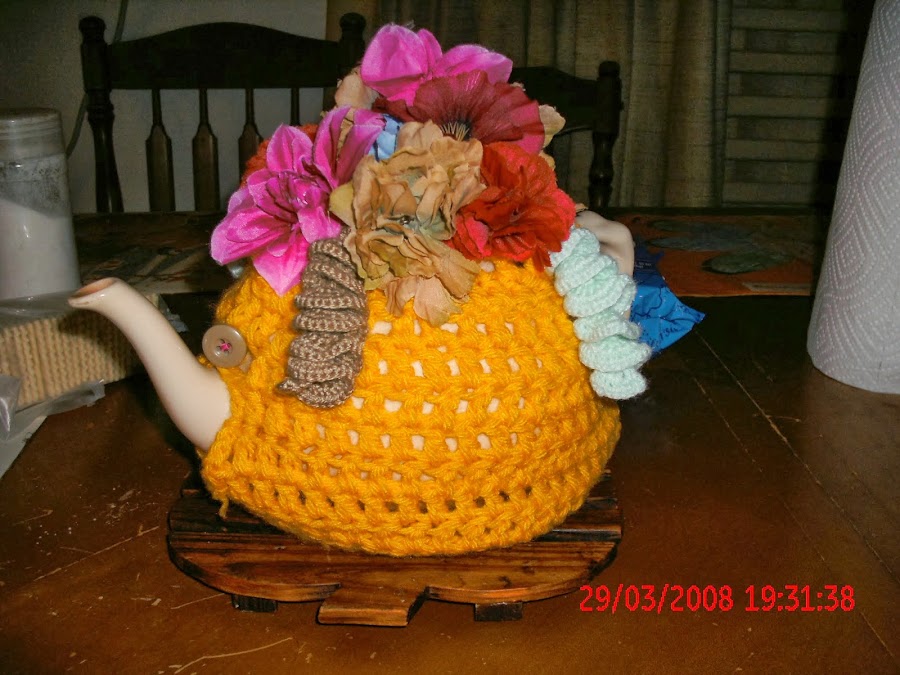 Este cubre tetera lo hice para mi hija, con restos de lana, tejido en punto vareta, en crochet,las flores son de telas, compradas y tiene unos rulos en lana que tejí en crochet, le puse un botón encima del pico y otro en la parte de la manija para ajustarlo,(la fecha que figura en la foto no es la real) no me di cuenta y tome las fotos asi