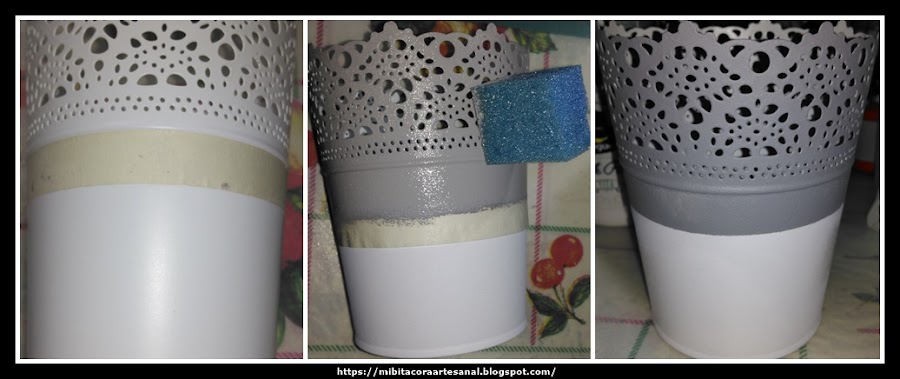 con cinta de pintor separo las partes a la altura que quiero dividir el cubremaceta para pintarlo en los colores gris niebla y gris humo,