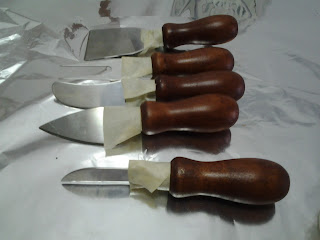 Como os decía, los pinté de color chocolate, y así los dejé... para empezar protegí con la cinta de carrocero la parte de la cuchilla y el embellecedor... pasé una vela por las zonas donde quería que saliese posteriormente el color original, después los pinté en crudo y una vez seco los lijé un poquito para dar el efecto envejecido que tanto me gusta jejeje!!
