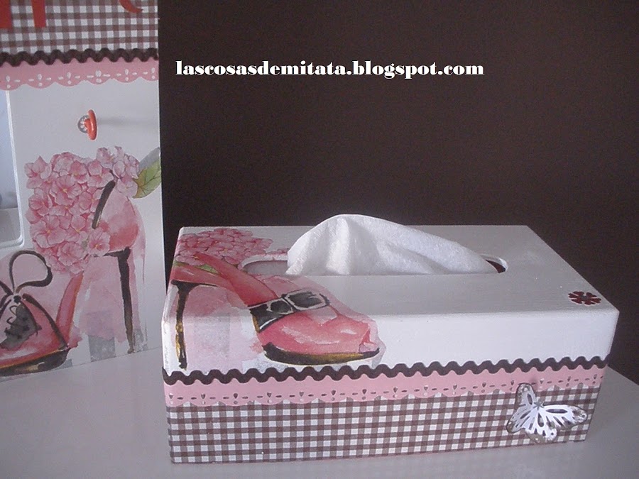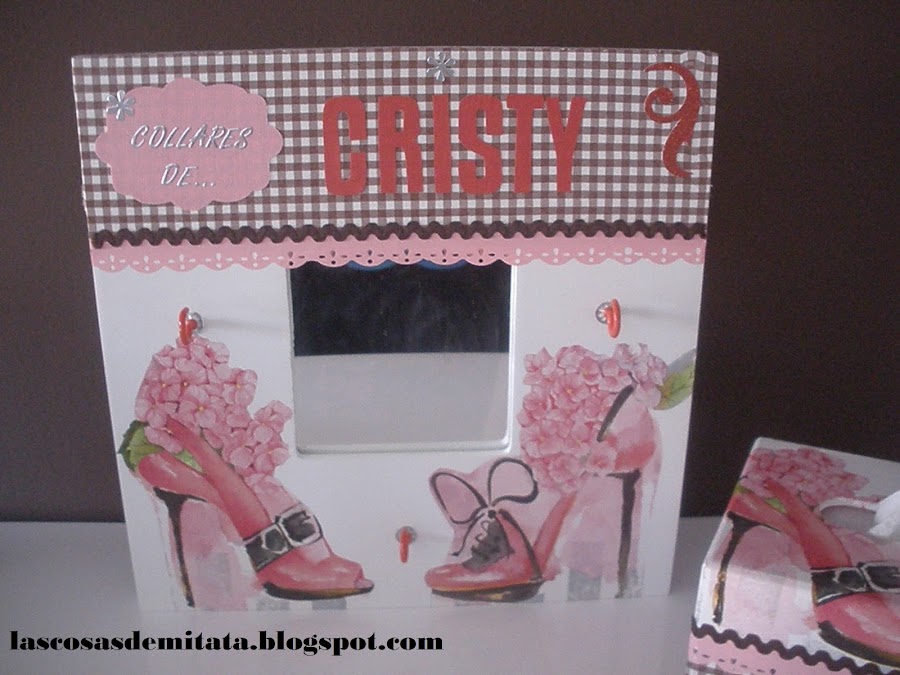 Este conjunto formado por Malma para colgar los collares y caja de pañuelos, ambos decorados en decoupage y personalizados, son un regalo de cumpleaños que Jenny me ha encargado para su amiga Cristy. Ella dudaba entre varias cosas personalizadas pero cuando vio como quedó un malma que ya hice anteriormente no tuvo ninguna duda y además le pareció buena idea que llevara una caja para pañuelos a juego, así que este ha sido el resultado y ahora espero que también le guste a Cristy.
