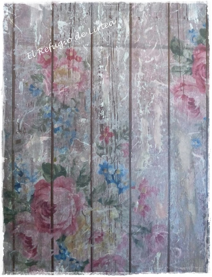 Toda la zona donde irá pegado el papel la pinto de blanco y el reto lo hago en el color lo más parecido al papel. Una vez pegado, protejo el papel con barniz mate y sigo trabajando sobre él.