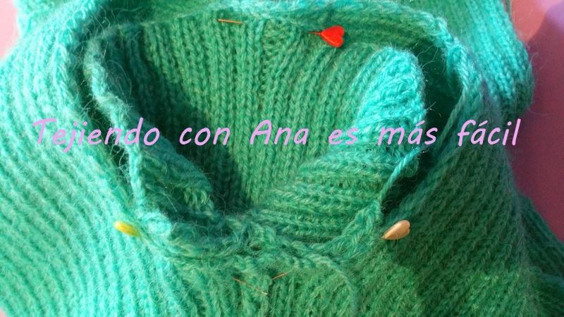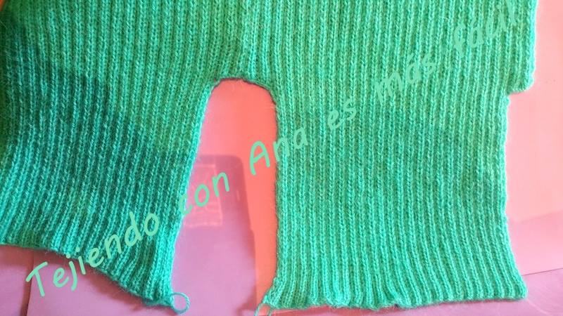 AQUÍ PUEDES APRECIAR la sisa y el escote , recuerda que desde la sisa tejeremos 21 cms, y antes de cerrar recto cambia a agujas del 3