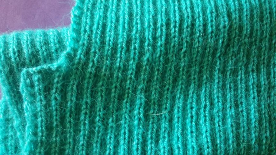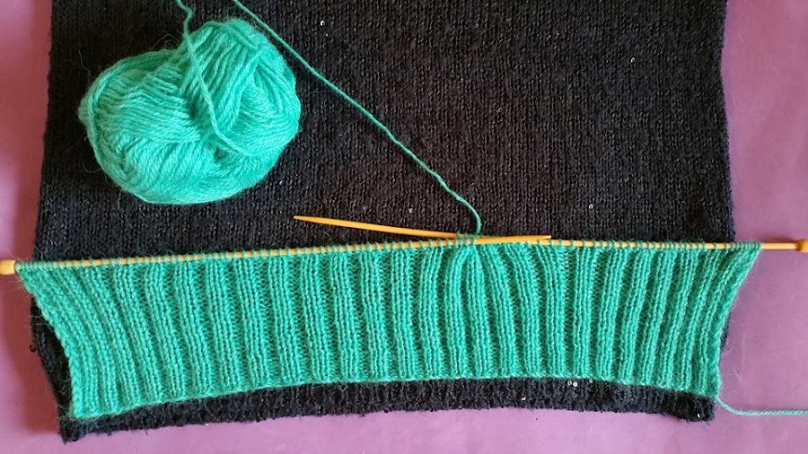 EMPEZAMOS POR LA ESPALDA, si te fijas en la foto, se aprecia la cenefa tejida con una aguja menor, esto hace que nuestro jersey quede impecable y no se estiren los bajos