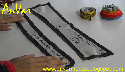 Cortamos 1 vez con tela doble la tirilla y una pieza de fliselina de pegar